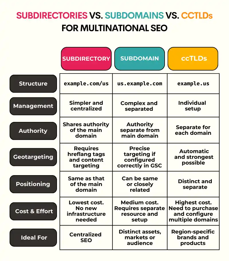 Here’s how to strategically go about choosing between subdirectories, subdomains, and ccTLDs.